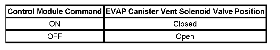 The table illustrates the relationship between the ON and OFF states, and the OPEN or CLOSED states of the EVAP canister vent solenoid valve.