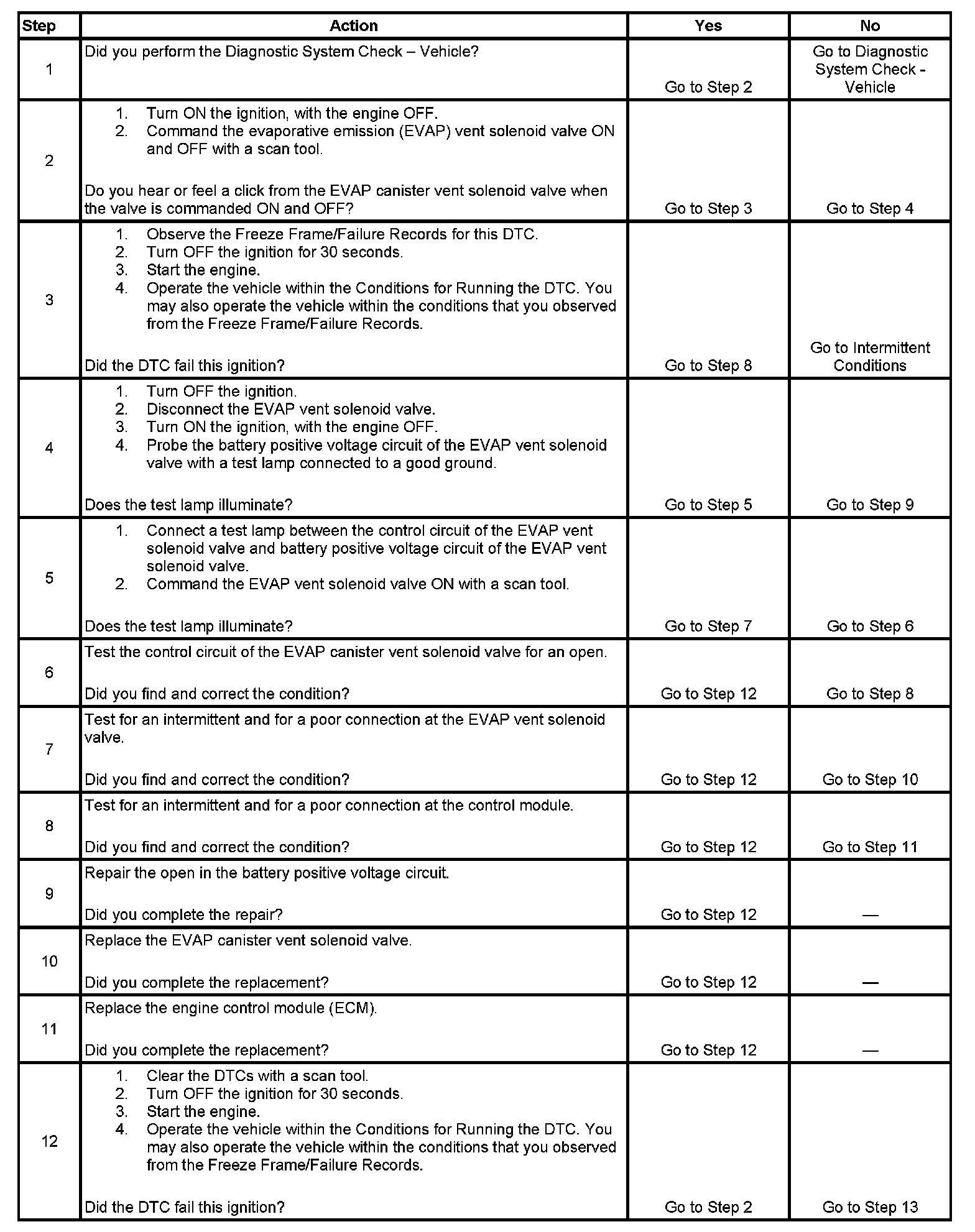 An ignition voltage is supplied to the evaporative emission (EVAP) canister vent solenoid valve. The control module grounds the EVAP canister vent solenoid valve control circuit to close the valve by means of an internal switch called a driver. The scan tool displays the commanded state of the EVAP canister vent solenoid valve as ON or OFF. The control module monitors the status of the driver. If the control module detects an open circuit on the control circuit when the driver is commanded OFF, this DTC sets.