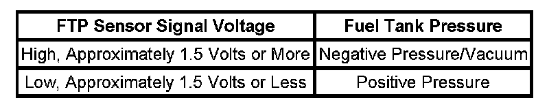 The table illustrates the relationship between the FTP sensor signal voltage and the EVAP system pressure/vacuum.