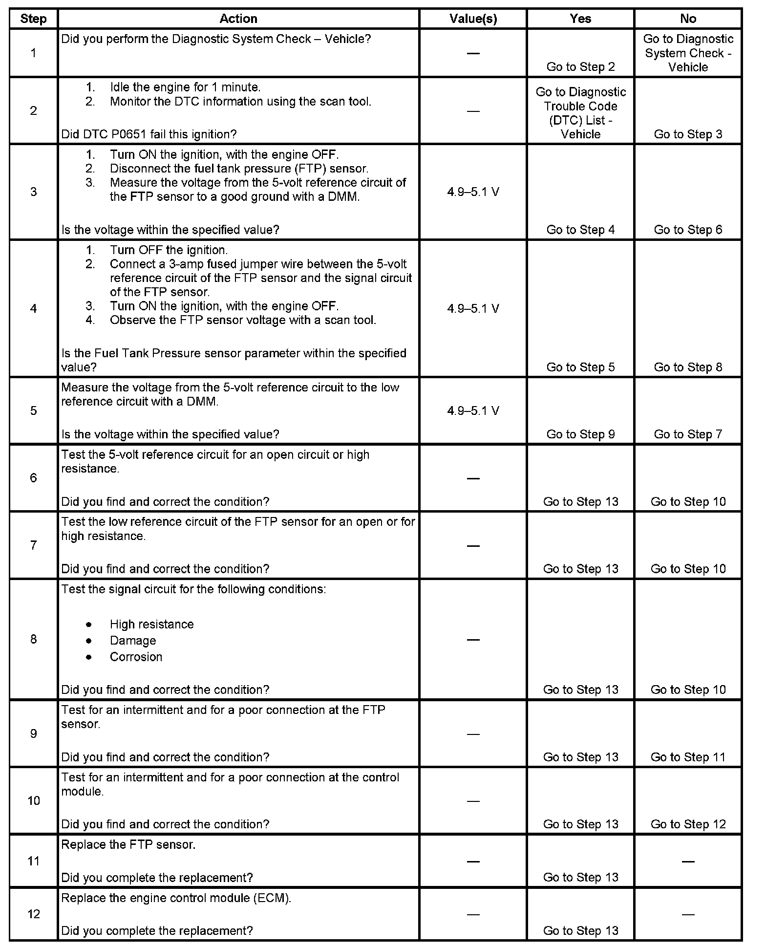 The fuel tank pressure (FTP) sensor measures the difference between the air pressure or vacuum in the evaporative emission (EVAP) system and the outside air pressure. The control module supplies a 5-Volt reference and a low reference circuit to the FTP sensor. The FTP sensor signal circuit voltage varies depending on EVAP system pressure or vacuum. If the FTP sensor signal voltage becomes fixed while driving, or fluctuates more than a calibrated amount at idle, this DTC sets.