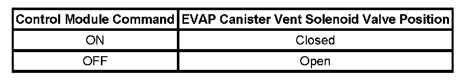 The table illustrates the relationship between the ON and OFF states, and the OPEN or CLOSED states of the EVAP canister vent solenoid valve.