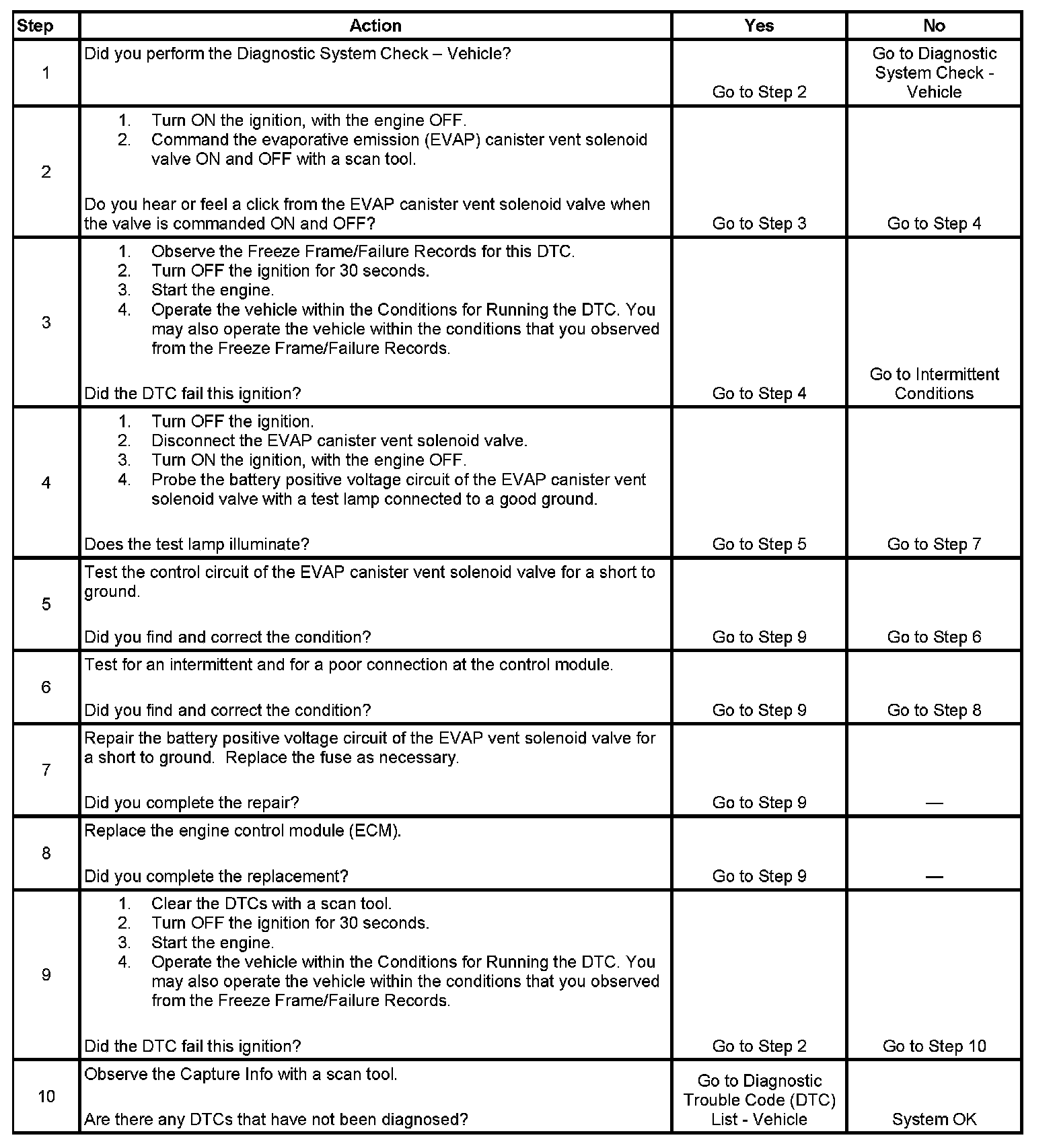 Battery voltage is supplied directly to the evaporative emission (EVAP) canister vent solenoid valve. The control module grounds the EVAP canister vent solenoid valve control circuit to close the valve by means of an internal switch called a driver. The scan tool displays the commanded state of the EVAP canister vent solenoid valve as ON or OFF. The control module monitors the status of the driver. If the control module detects low voltage on the control circuit when the driver is commanded OFF, this DTC sets.