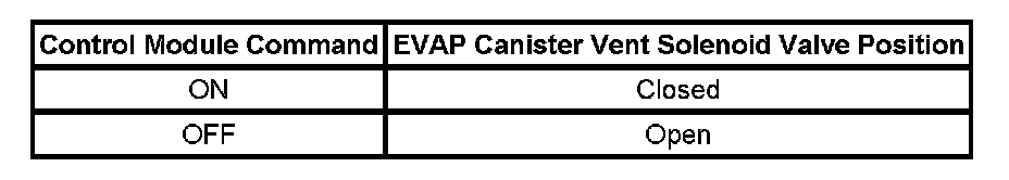 The table illustrates the relationship between the ON and OFF states, and the OPEN or CLOSED states of the EVAP canister vent solenoid valve.