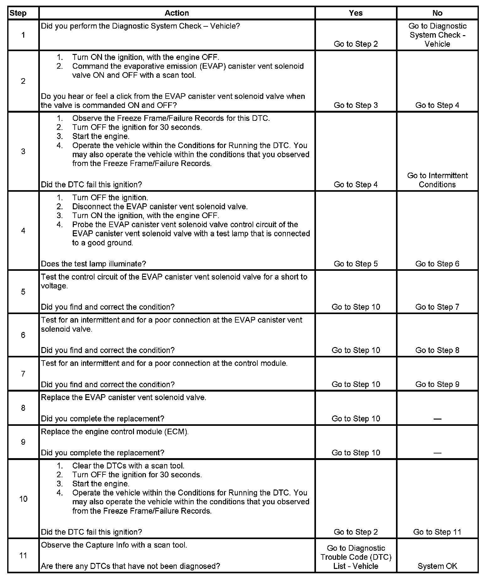 Battery voltage is supplied to the evaporative emission (EVAP) canister vent solenoid valve. The control module grounds the EVAP canister vent solenoid valve control circuit to close the valve by means of an internal switch called a driver. The scan tool displays the commanded state of the EVAP canister vent solenoid valve as ON or OFF. The control module monitors the status of the driver. If the control module detects voltage on the control circuit when the driver is commanded ON, this DTC sets.
