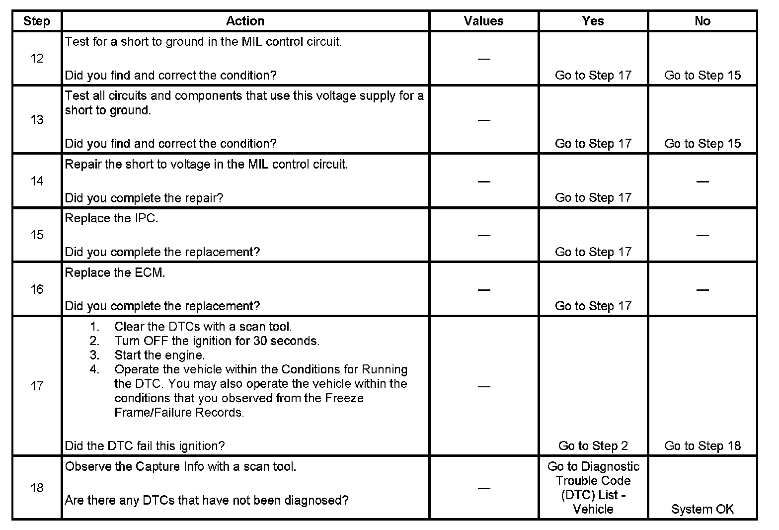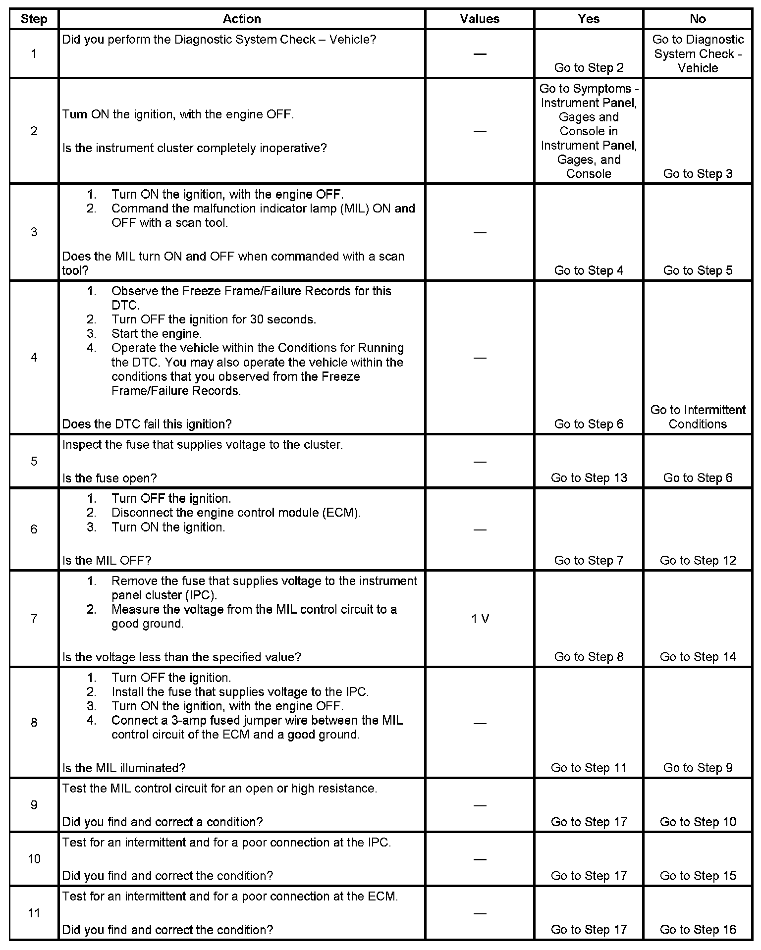6. This step tests for a short to ground in the MIL control circuit. With the engine control module (ECM) disconnected and the ignition ON, the MIL should be OFF.