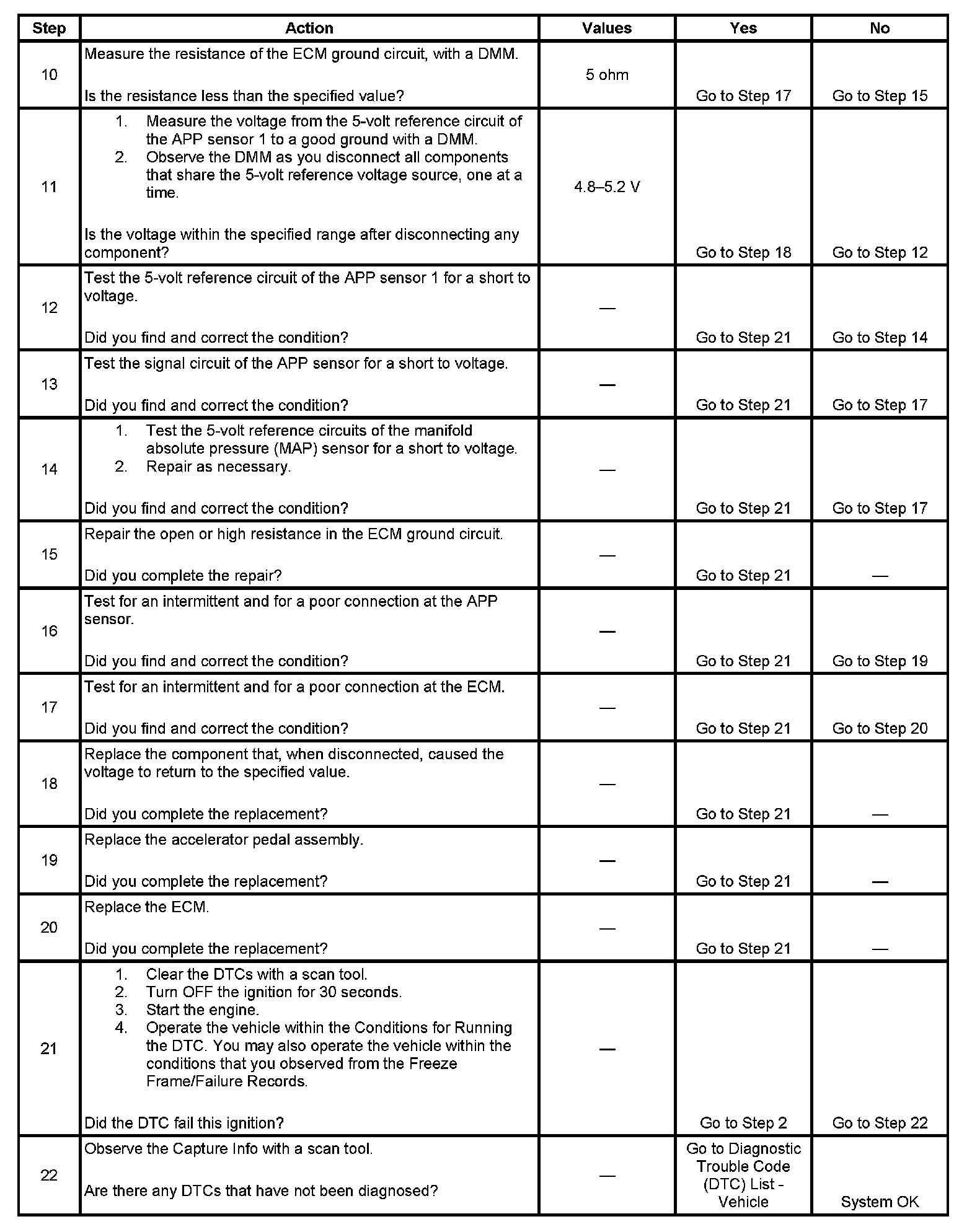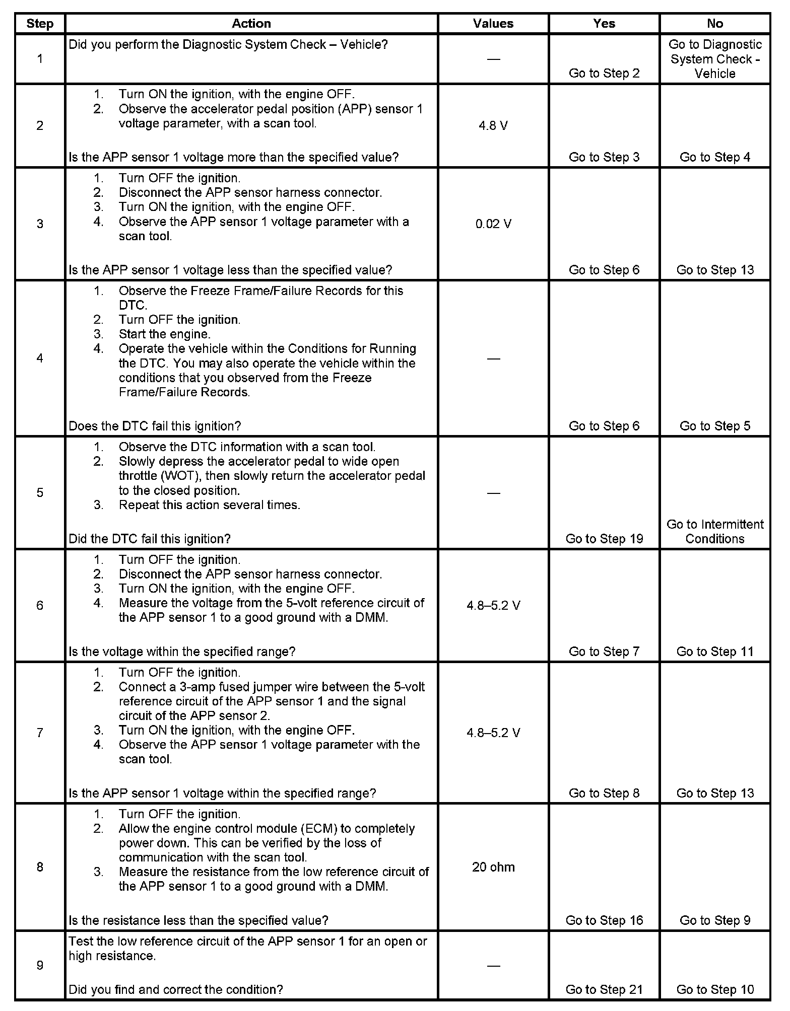 This provides the engine control module (ECM) with a signal voltage proportional to accelerator pedal movement. The APP sensor 1 signal voltage at the rest position is near the low reference and increases as the pedal is actuated. If the ECM detects that the signal voltage is more than 4.8 volts, DTC P2123 sets.