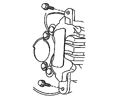 Notice: Support the brake caliper with heavy mechanic's wire, or equivalent, whenever it is separated from its mount and the hydraulic flexible brake hose is still connected. Failure to support the caliper in this manner will cause the flexible brake hose to bear the weight of the caliper, which may cause damage to the brake hose and in turn may cause a brake fluid leak.