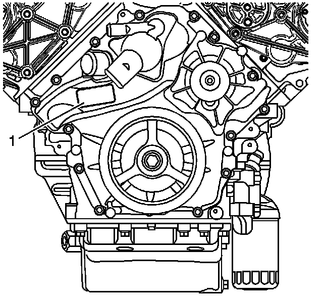The engine front cover has an engine verification label (1).