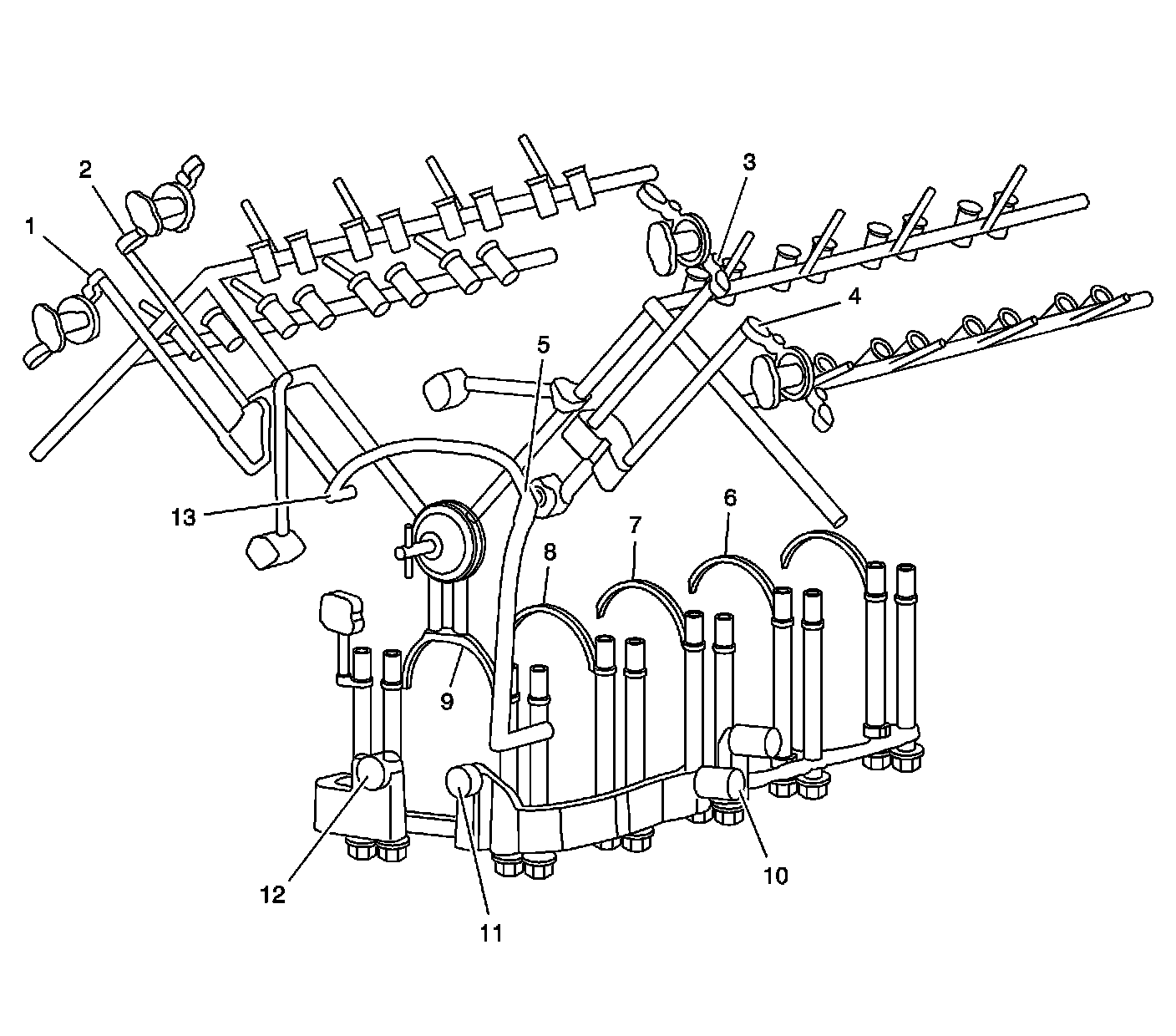 Oil to operate the camshaft position actuator system is supplied by the oil outlet tube located under the timing chain drive system. The oil outlet tube is sealed to the front of the engine block next to the oil pump with an O-ring. Oil travels up through the tube and is filtered by an integral screen. Oil is distributed by the oil outlet tube to both sides of the engine block just below the engine block deck (5, 13). A chamber within the block directs oil up 2 passages through the engine block deck and into 2 passages in each cylinder head. Oil supplied to the front camshaft bearing cap groove (1-4) supplies oil to passages drilled into the front camshaft journal. Oil passes through the center of the camshaft and into the camshaft position actuator oil control valve. The spool valve within the camshaft position actuator oil control valve directs the oil in and out of the camshaft position actuator. The spool valve is actuated by a magnetic field created by the camshaft position actuator magnet. The camshaft position actuator magnet is mounted to the camshaft position actuator housing bolted onto the front of each cylinder head. Oil pressure applied to either side of the internal vanes of the camshaft position actuator allows the ECM to vary the valve timing between the exhaust and intake camshafts.
