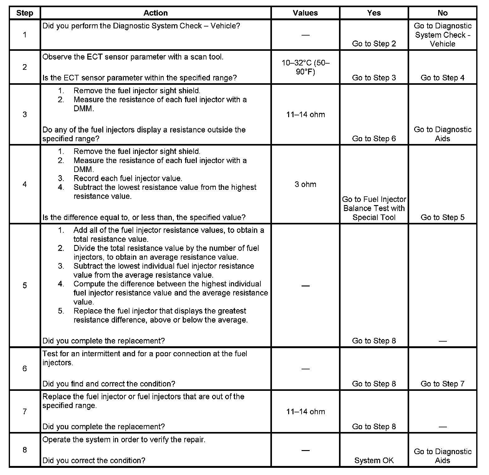 - Perform the fuel injector coil test within the conditions of the customer's concern. A fuel injector condition may only be apparent at a certain temperature, or under certain conditions.