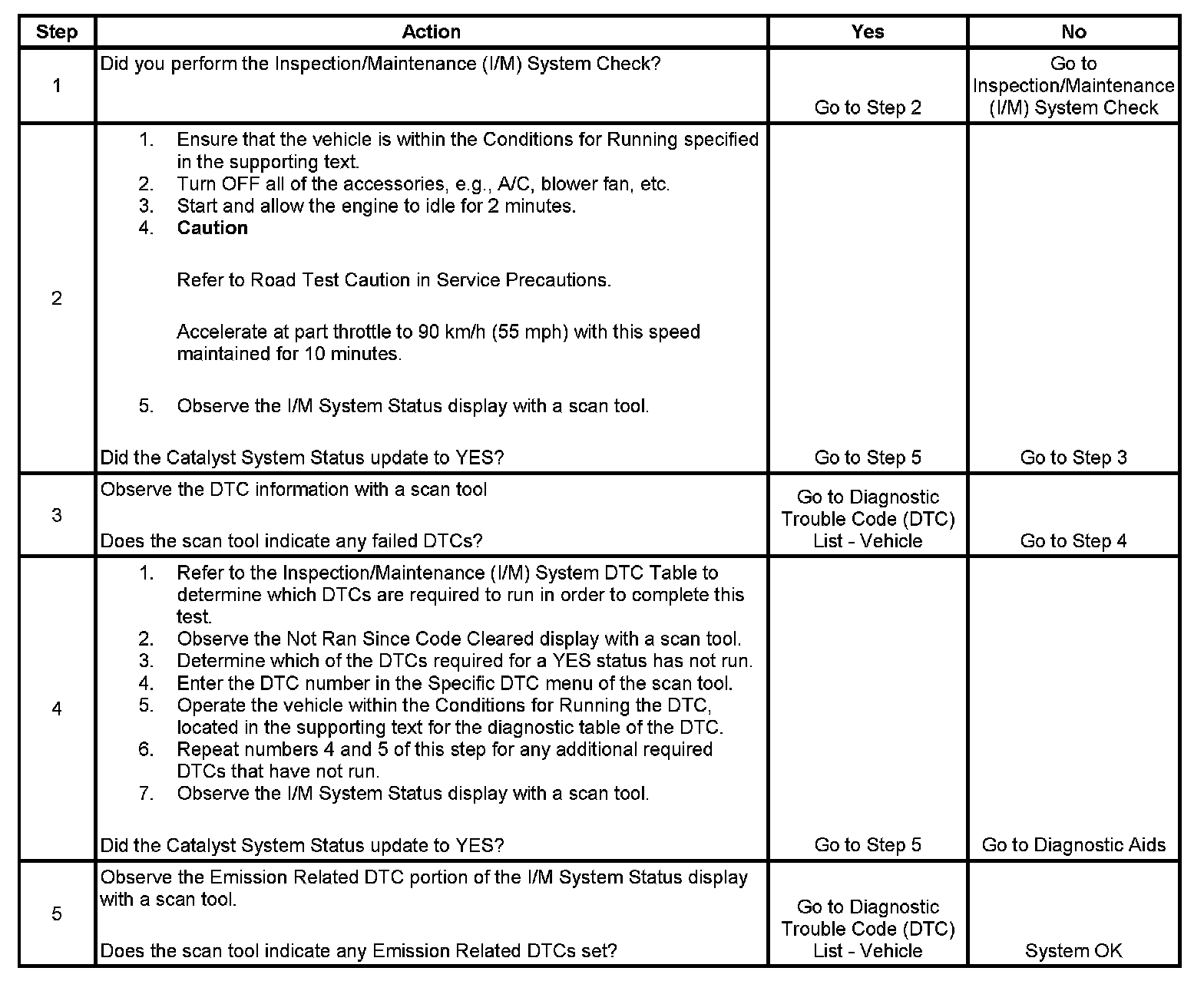 The purpose of this test is to satisfy the enable criteria necessary to execute inspection/maintenance (I/M) readiness diagnostics for the Catalyst System. The test may be used to set the I/M System Status indicators to YES.