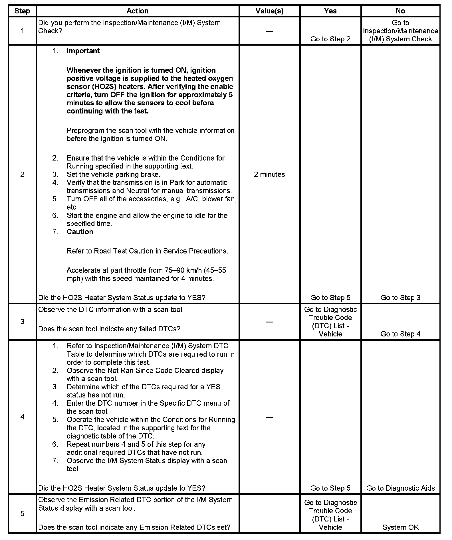 The purpose of this test is to satisfy the enable criteria necessary to execute inspection/maintenance (I/M) readiness diagnostics for the Heated Oxygen Sensor (HO2S) System. The test may be used to set the I/M System Status to YES.