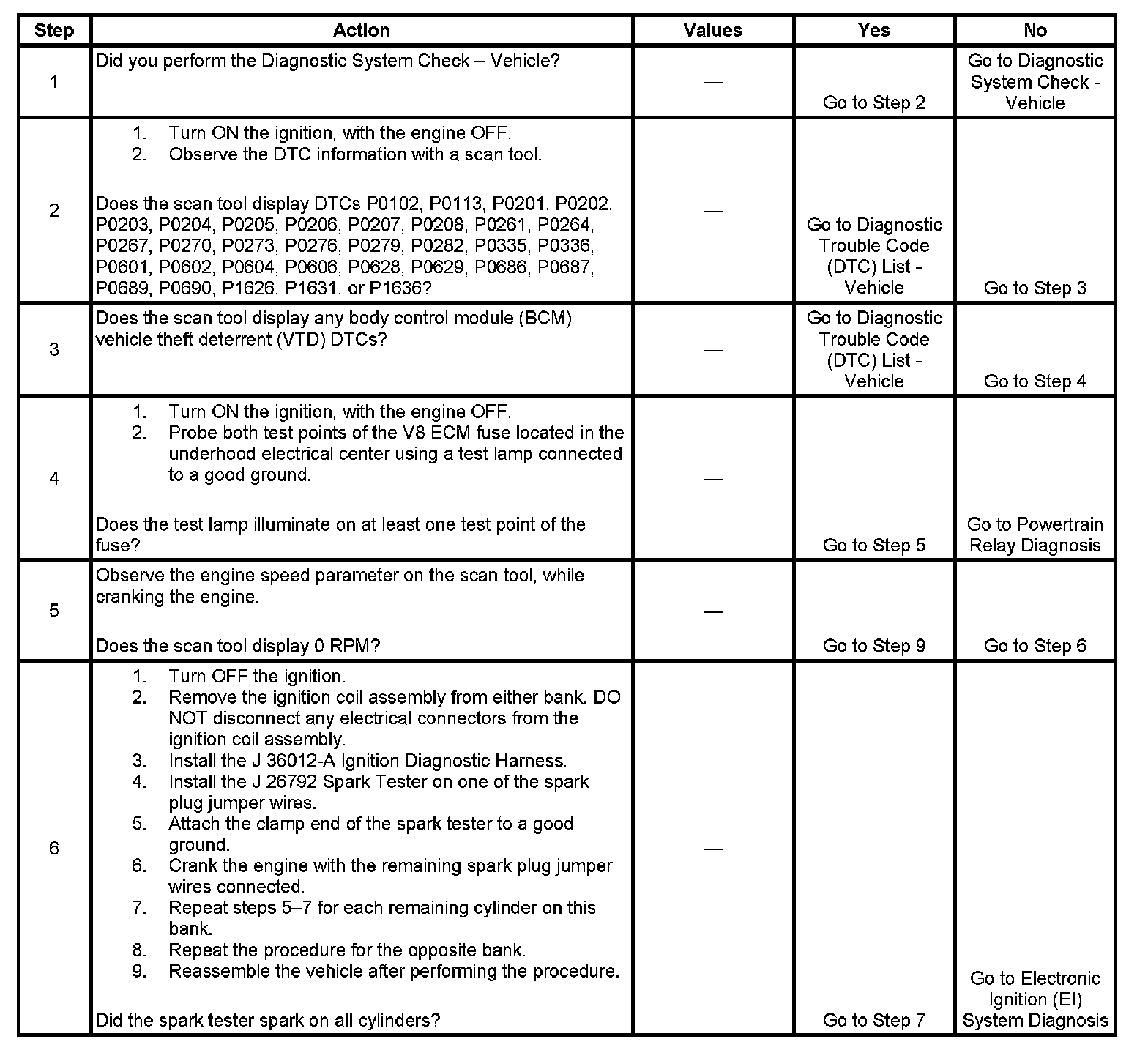 The Engine Cranks but Does Not Run diagnostic table is an organized approach to identifying a condition that causes an engine to not start. The diagnostic table directs the service technician to the appropriate system diagnosis. The diagnostic table assumes the following conditions are met: