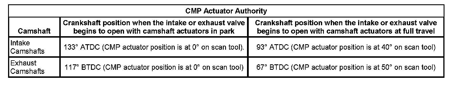 The CMP actuators interface the timing chain to the camshafts, and are able to change the camshaft timing in relation to the crankshaft. The intake CMP actuators have the ability to move the intake camshafts a total of 40 degrees from the parked position. The exhaust CMP actuators have the ability to move the exhaust camshafts a total of 50 degrees from the parked position. With the engine OFF or with the CMP actuators not commanded, the exhaust CMP actuators are parked at the full advance position of 133 degrees ATDC and the intake CMP actuators are parked at the full retard position of 117 degrees before top dead center (BTDC). The CMP Angle parameters on the scan tool will indicate 0 degrees with the engine running and the CMP actuators in the parked position for both exhaust and intake camshafts.