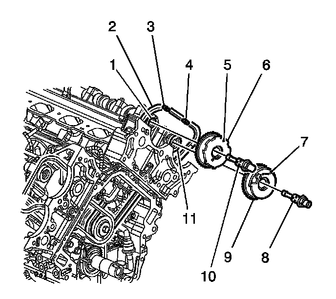 1. Remove the left intake camshaft position actuator oil control valve (10).