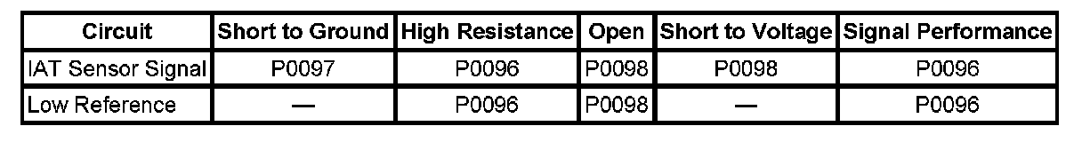 The IAT sensor 2 is less than -39°C (-38°F) for more than 1 second. This is equal to or more than 4.86 volts on the IAT signal circuit as measured by the ECM for P0098.
