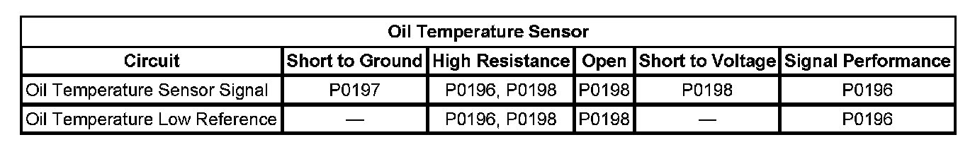 1. If DTC P0112, P0113, P0116, P0117, P0118, P0197, or P0198 are set, refer to Diagnostic Trouble Code (DTC) List - Vehicle. Diagnostic Trouble Code Descriptions