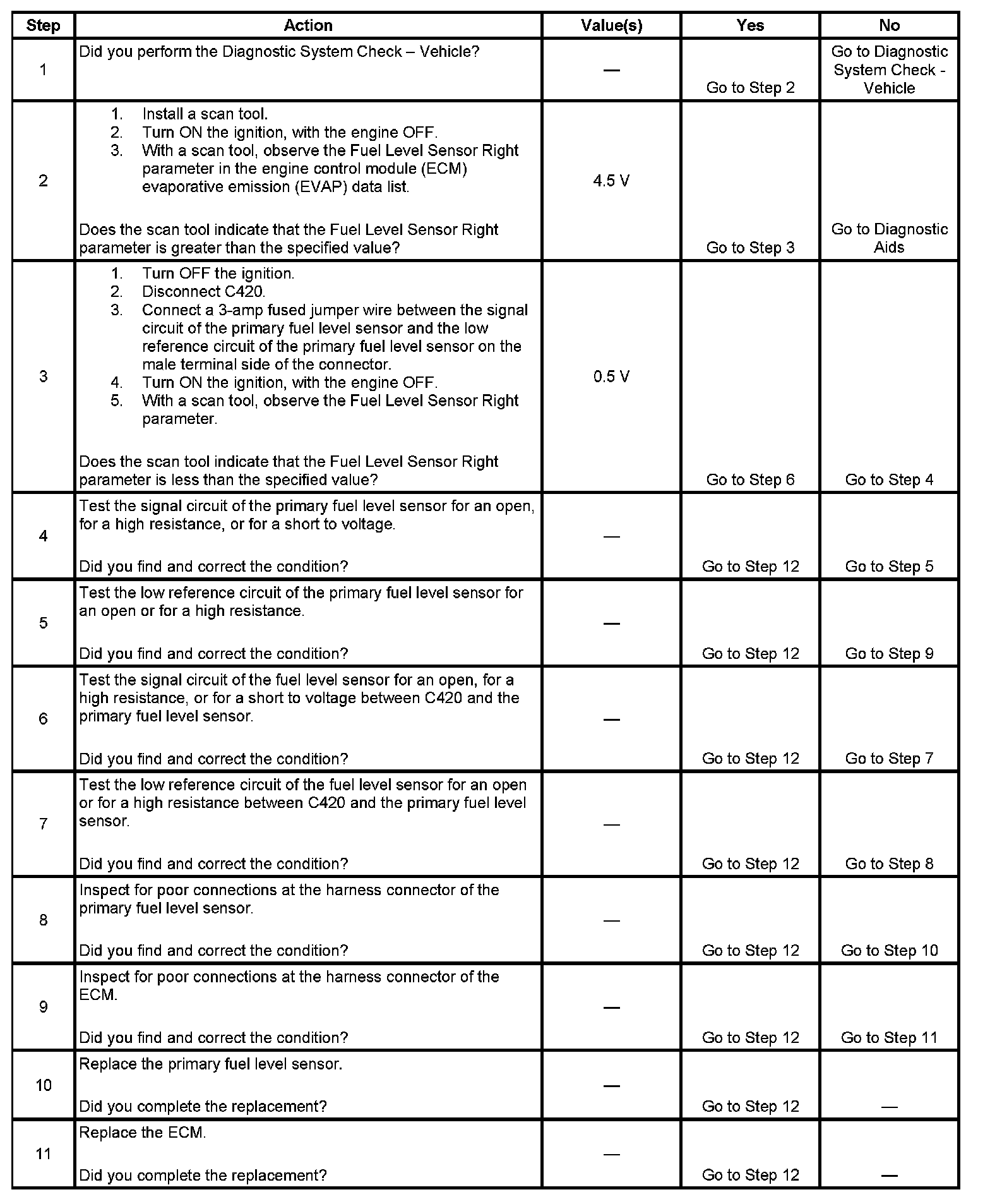 The primary fuel level sender and the secondary fuel level sender change resistance in response to fuel level. The engine control module (ECM) monitors the signal circuit of the primary fuel level sender and the secondary fuel level sender in order to determine the fuel level. When the fuel tanks are full, the resistances of both fuel level senders are high, and the ECM senses a high signal voltage on both the signal circuit of the primary fuel level sender and the signal circuit of the secondary fuel level sender. When the fuel tanks are empty, the resistances of the fuel level senders are low, and the ECM senses a low signal voltage. The ECM uses the signal circuits of the primary fuel level sender and the secondary fuel level sender in order to calculate the percentage of remaining fuel in the tanks. The ECM sends the fuel level percentage via the GMLAN serial data circuit to the instrument cluster in order to control the fuel gage. The fuel level information is also used for misfire and evaporative emission (EVAP) diagnostics. This diagnostic tests for a higher than normal primary fuel level sender signal.