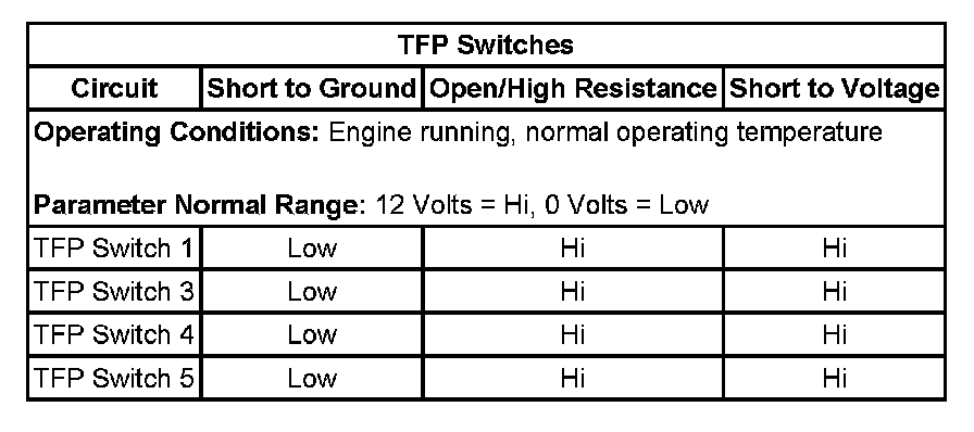 The transmission fluid pressure (TFP) switch 4 is part of the control solenoid (w/body and TCM) valve assembly and is not serviced separately. The TCM supplies 12 volts to the TFP Switch 4 on the TFP Switch 4 signal circuit; the TFP Switch 4 has an internal case ground. TFP Switch 4 is normally closed, Low. When oil pressure is present at the TFP Switch 4, the switch is Open, High. The normally low clutch pressure control (PC) solenoid 4 controls the transmission fluid to the 1-2-3-4 clutch. The TCM monitors the normally closed TFP Switch 4 signal circuit to determine the 1-2-3-4 clutch status.