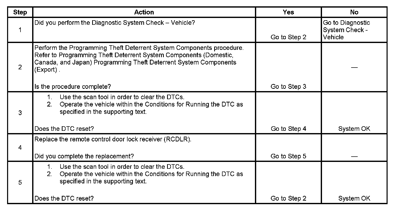 5. If the ECM resets the DTC after the programming theft deterrent system components procedure has been performed, the RCDLR is malfunctioning.