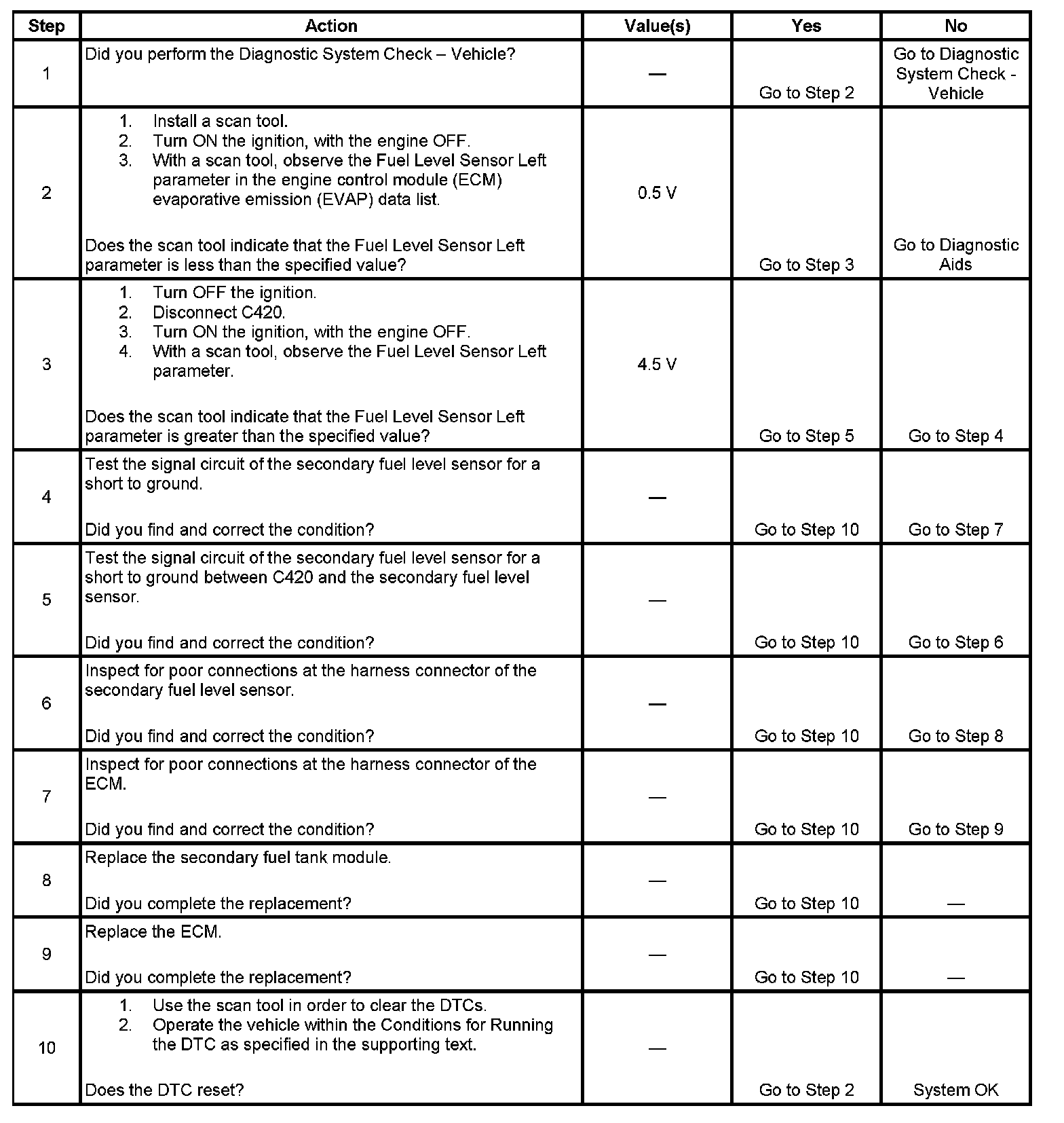 The primary fuel level sender and the secondary fuel level sender change resistance in response to fuel level. The engine control module (ECM) monitors the signal circuit of the primary fuel level sender and the signal circuit of the secondary fuel level sender in order to determine the fuel level. When the fuel tanks are full, the resistances of both fuel level senders are high, and the ECM senses a high signal voltage on both the signal circuit of the primary fuel level sender and the signal circuit of the secondary fuel level sender. When the fuel tanks are empty, the resistances of the fuel level senders are low, and the ECM senses a low signal voltage. The ECM uses the signal circuits of the primary fuel level sender and the secondary fuel level sender in order to calculate the percentage of remaining fuel in the tanks. The ECM sends the fuel level percentage via the GMLAN serial data circuit to the instrument cluster in order to control the fuel gage. The fuel level information is also used for misfire and evaporative emission (EVAP) diagnostics. This diagnostic tests for a lower than normal secondary fuel level sender signal.
