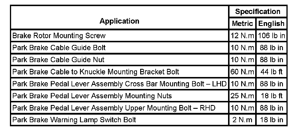Parking Brake System: Specifications