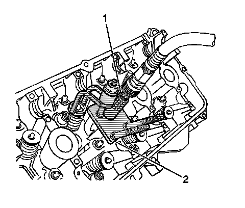 8. Install the arm and swivel nut of the J 44211 (2) over the stud corresponding to the valve to be serviced.