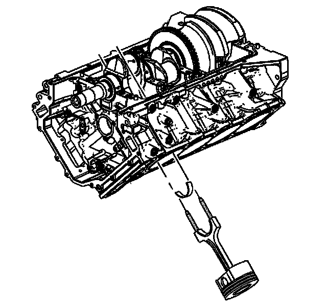 8. Using the EN 46121 push the connecting rod and piston assembly down through the top of the cylinder. Do not scratch the crankshaft journal or the cylinder wall when removing the connecting rod and piston assembly.