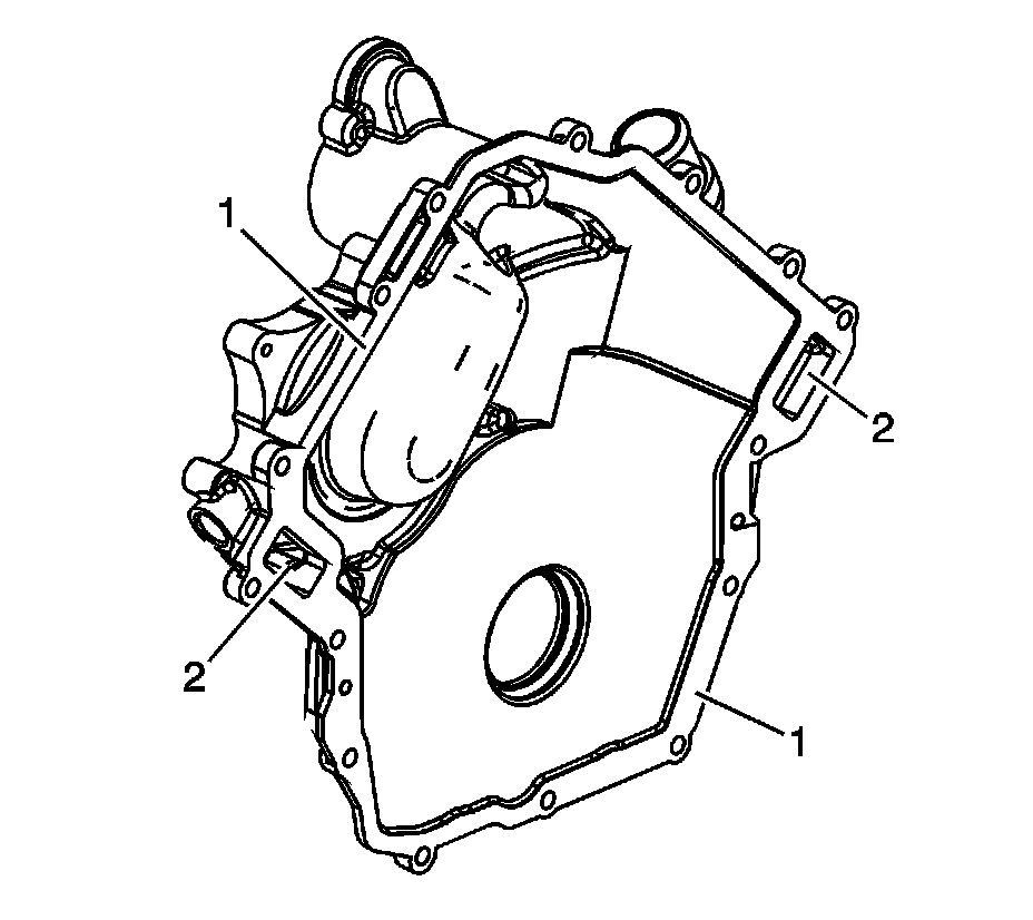 ^ Gouges or damage to the engine front cover sealing surface (1)