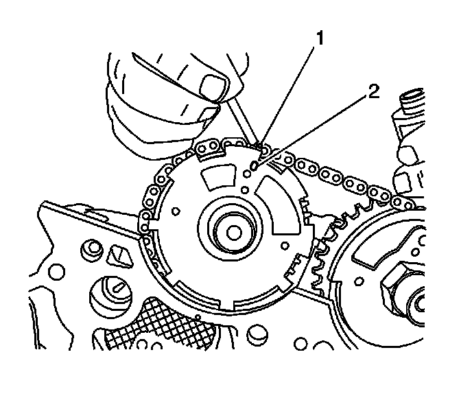 Use a paint stick to create a mark (1) on the timing chain link adjacent to each camshaft position actuator timing mark (2).