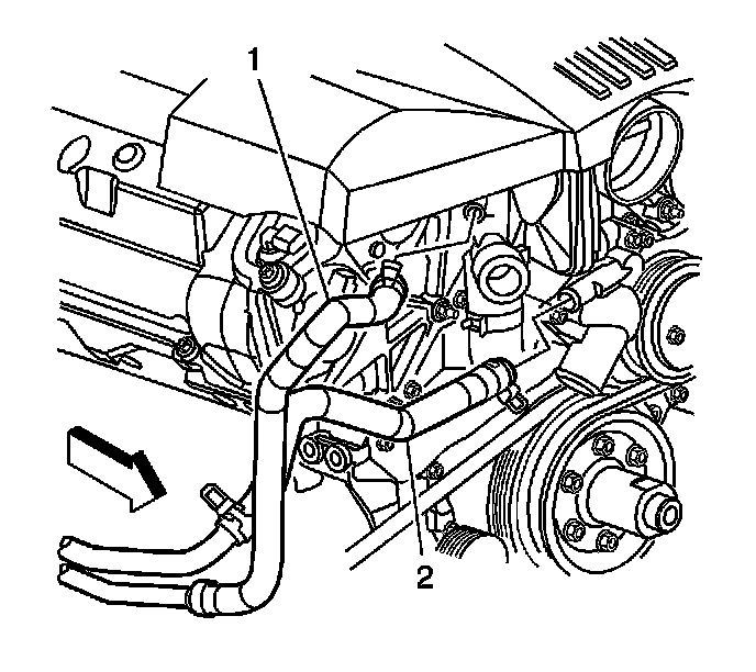 7. Using J 38185, disengage the hose clamp and connect the heater inlet hose (2) to the heater pipe assembly.