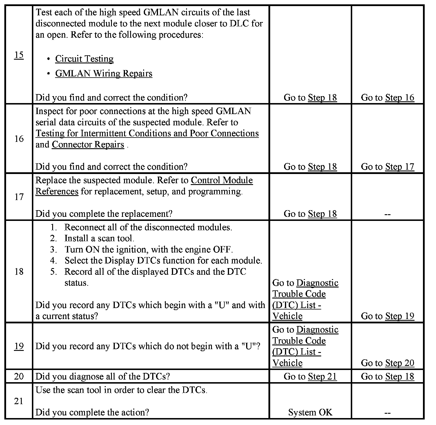 2. A partial malfunction in the high speed GMLAN serial data circuits uses a different procedure from a total malfunction of the high speed GMLAN data circuits. The scan tool communicates with the following modules on the high speed GMLAN serial data circuits: