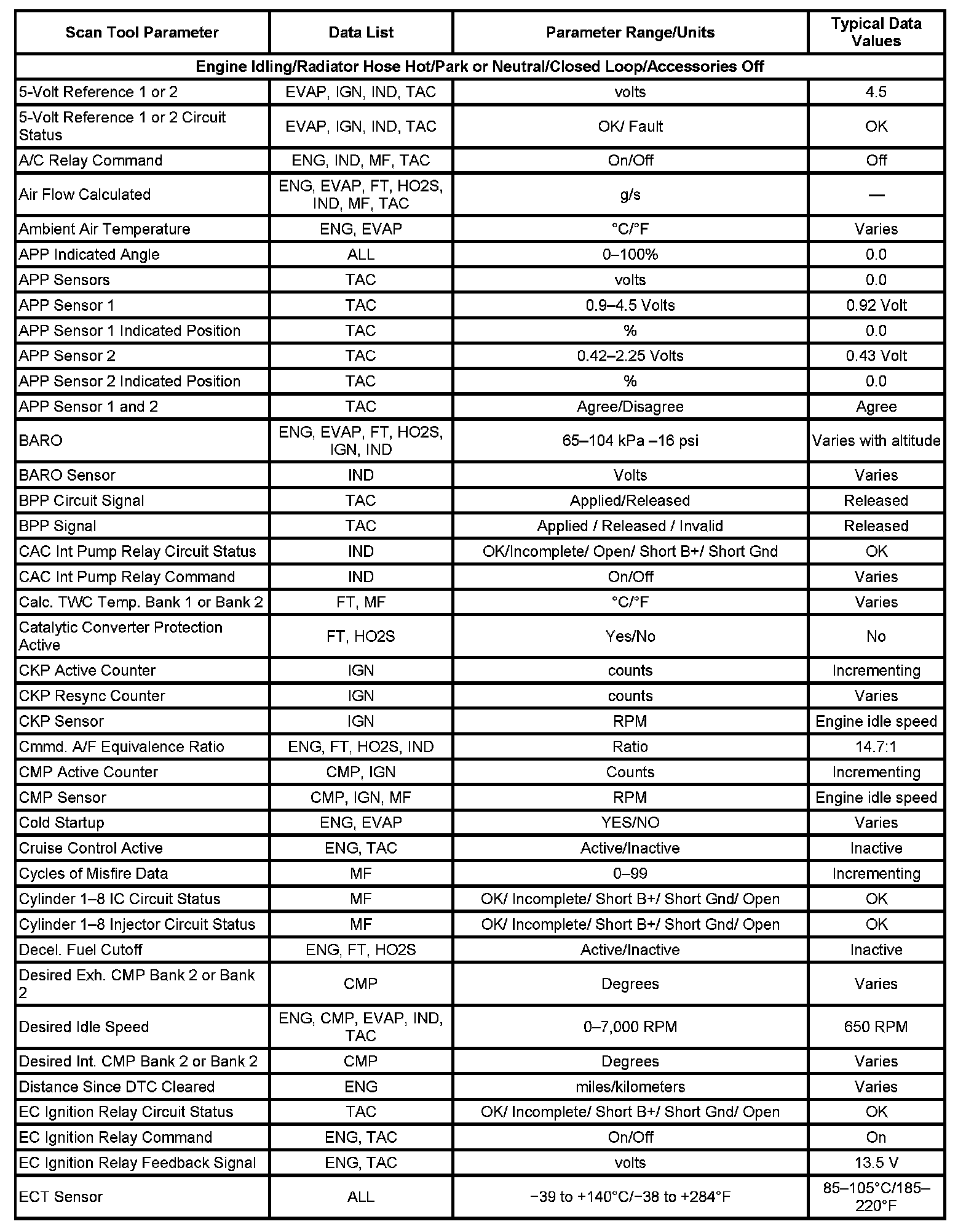 The Engine Scan Tool Data List contains all engine related parameters that are available on the scan tool. The list is arranged in alphabetical order. A parameter may appear in any one of the data lists, and in some cases may appear more than once, or in more than one data list in order to group certain related parameters together.