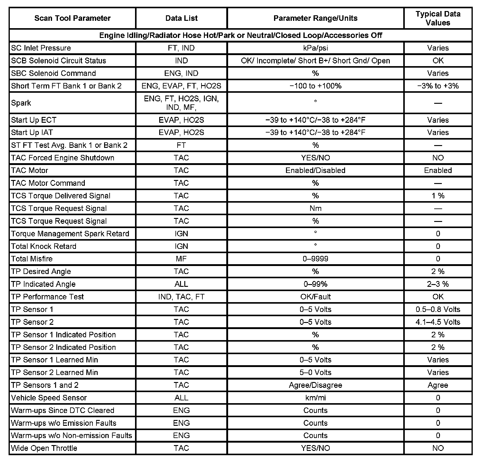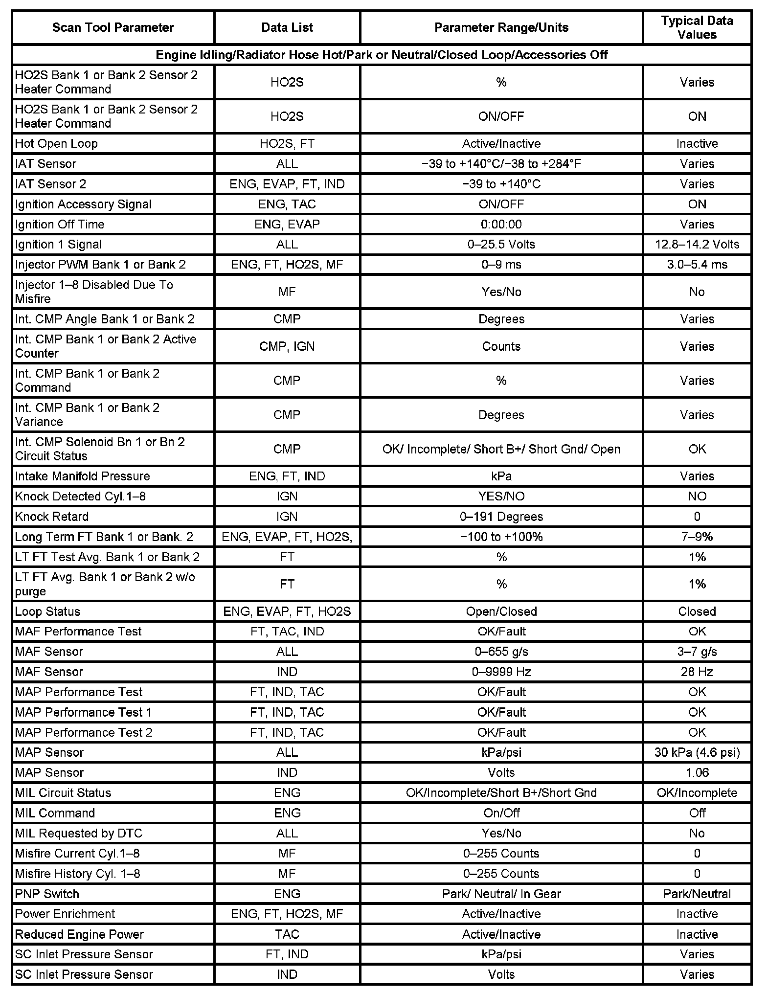 Scan tool values from a properly running engine may be used for comparison with the engine you are diagnosing. The Engine Scan Tool Data List represents the values that would be seen on a normal running engine.