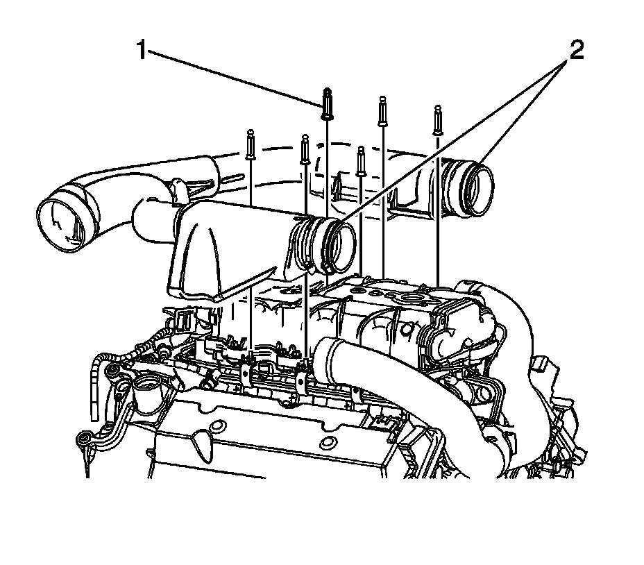 6. Remove the ball studs (1) that retain the inlet duct to the supercharger. There are a total of 6 ball studs.