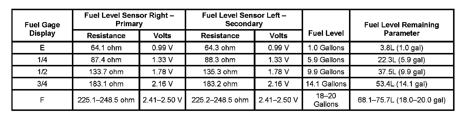 The information in this table is intended for use with the J 33431-C Signal Generator and Instrument Panel Tester. The fuel level sensor values represent the test values to be used on the Signal Generator to drive the fuel gage display to the indicated positions. Vehicles that require more than one fuel level sensor calculate gage position from many possible resistance combinations of fuel levels between the two tanks. Therefore, the values in the table may not correlate directly to readings taken from the vehicle primary or secondary sending units.