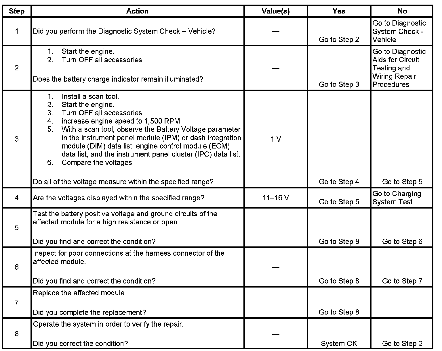 The driver information center (DIC) may display a "Charging System Failure" message. This message being displayed is the result of a class 2 message being sent by the engine control module (ECM), instrument panel module (IPM), dash integration module (DIM), or the instrument panel cluster (IPC) to the DIC. Each module has a different criteria for requesting the message to be displayed. Refer to Charging System Description and Operation.