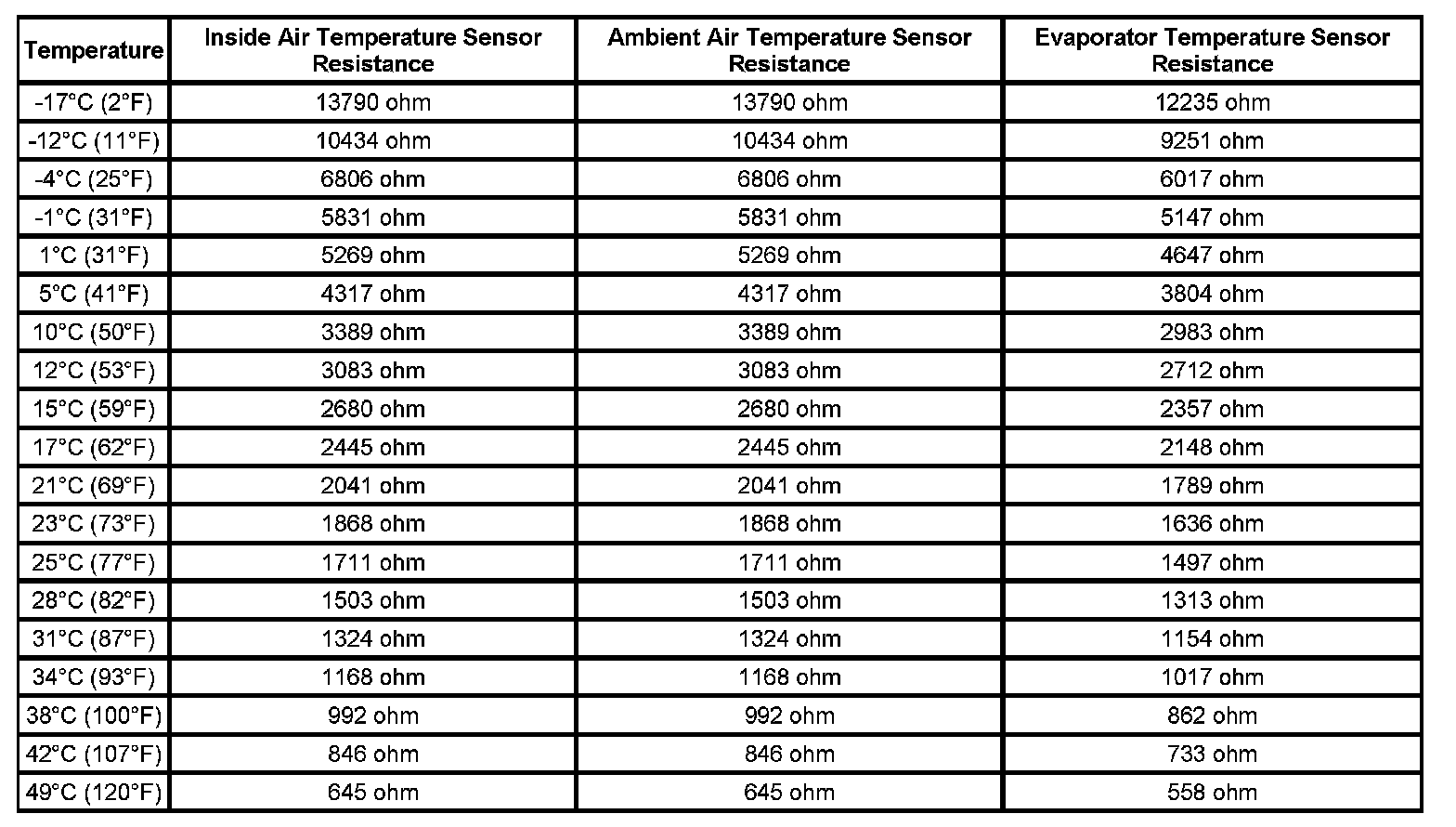 Sensor Resistance Table