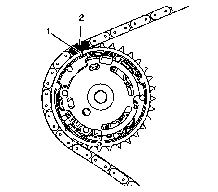 3. The left camshaft intermediate drive chain idler timing mark (1) will align with a timing camshaft drive chain link (2).
