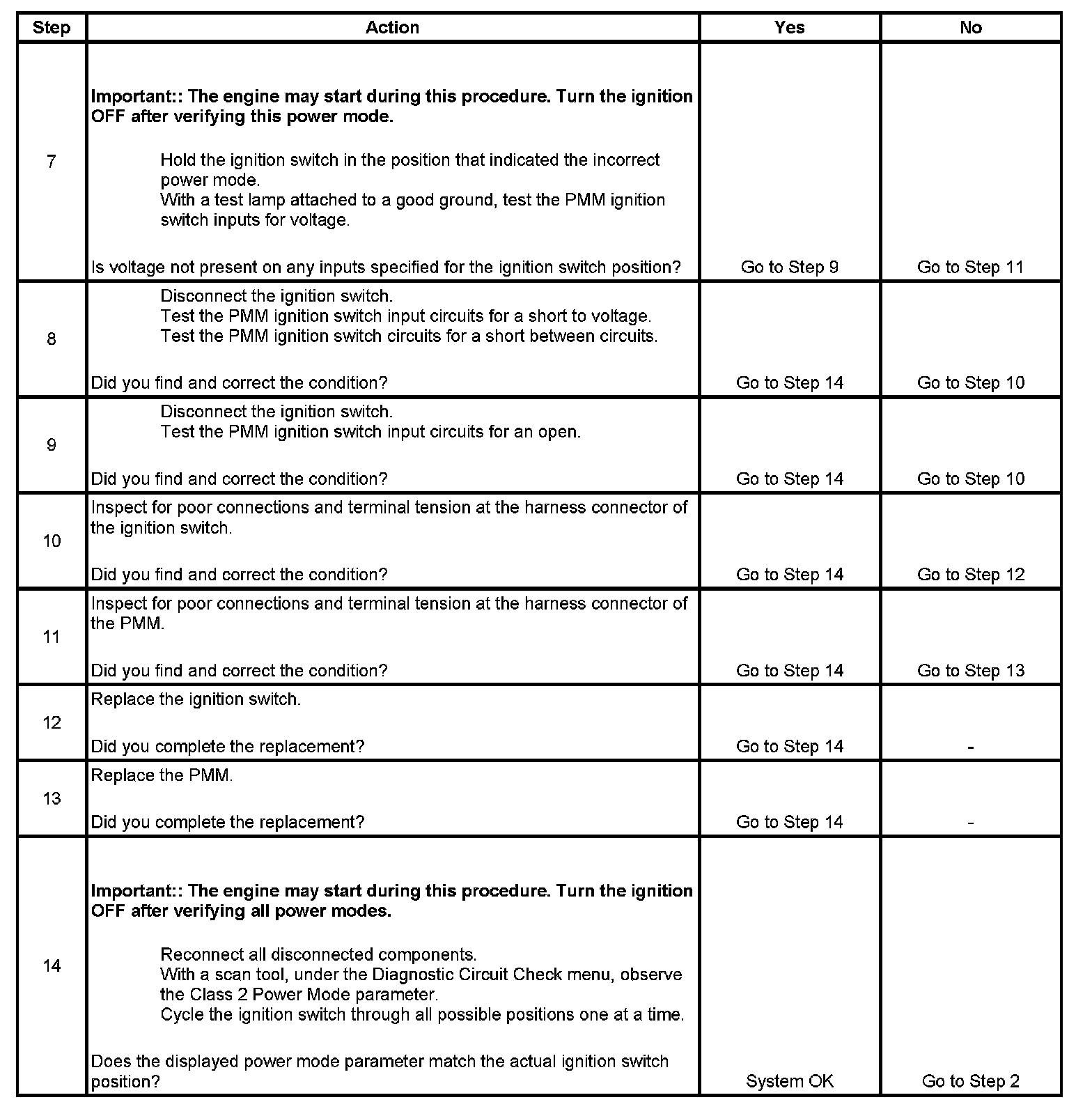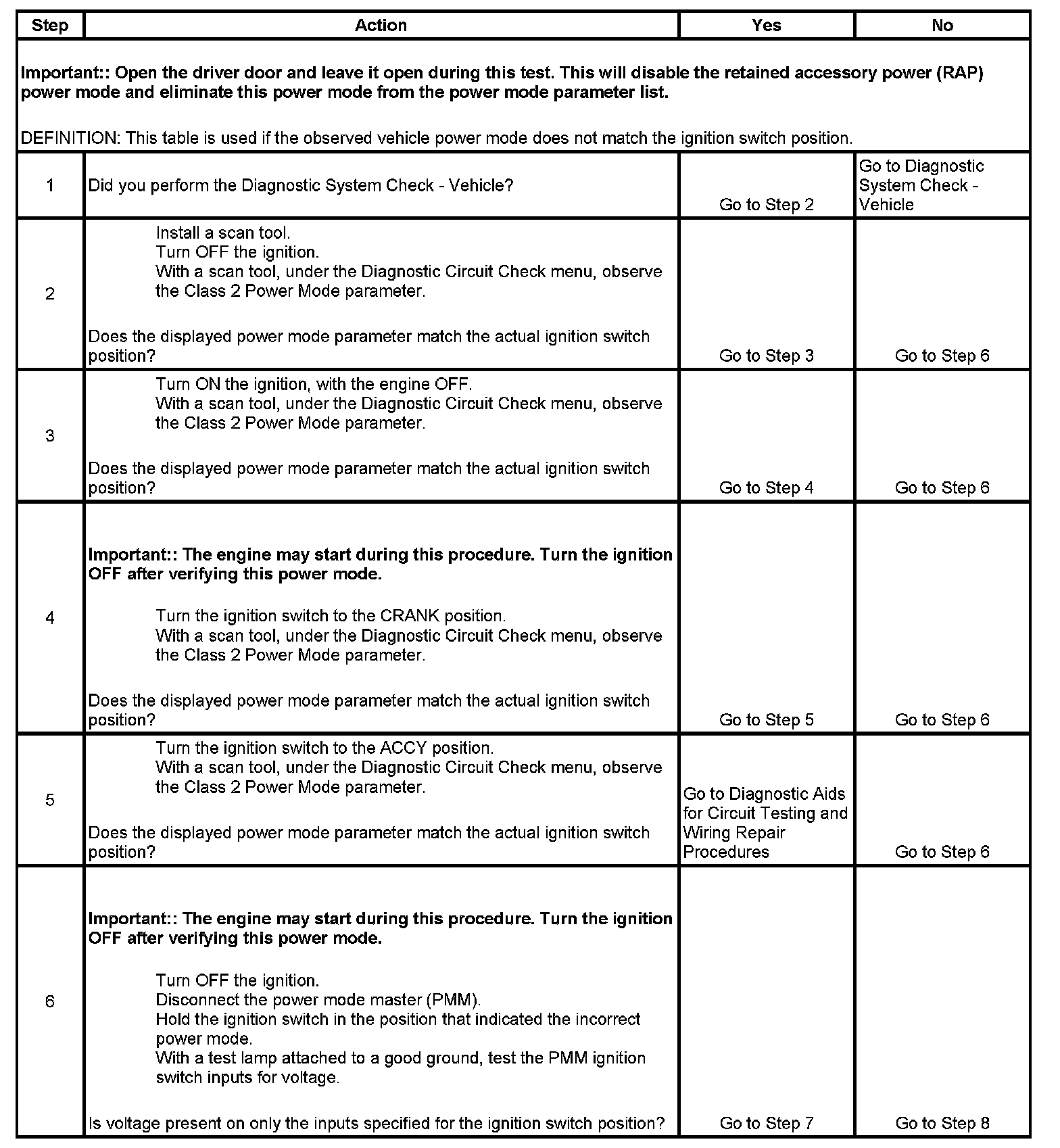 Normal vehicle class 2 communications and module operations will not begin until the system power mode has been identified. Discrete wires from the ignition switch contacts are monitored by the power mode master (PMM) module in order to determine the correct power mode. The PMM communicates the system power mode to all class 2 modules on the class 2 serial data line. Refer to Body Control System Description and Operation to identify which module is the PMM and the applicable power mode look up table.