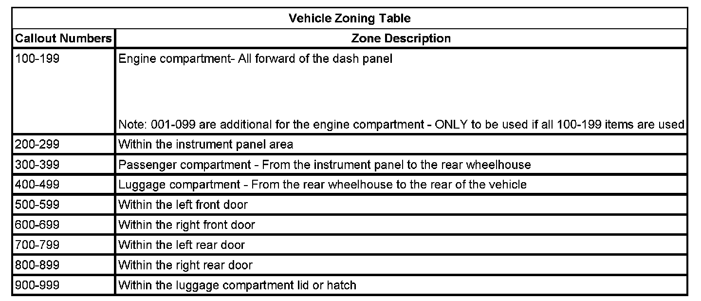 All grounds, in-line connectors, pass-through grommets, and splices have identifying numbers that correspond to where they are located in the vehicle. The following table explains the numbering system.