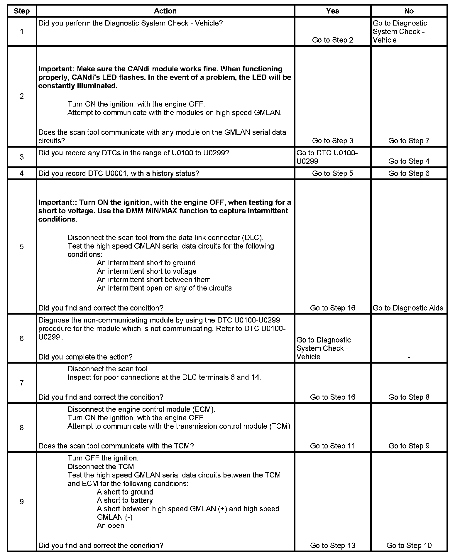 Modules connected to the high speed GMLAN serial data circuits monitor for serial data communications on the high speed GMLAN network during normal vehicle operation. Operating information and commands are exchanged among the modules. When a module detects a bus-off condition, a DTC U0001 will be set. This DTCs can be retrieved as history only.