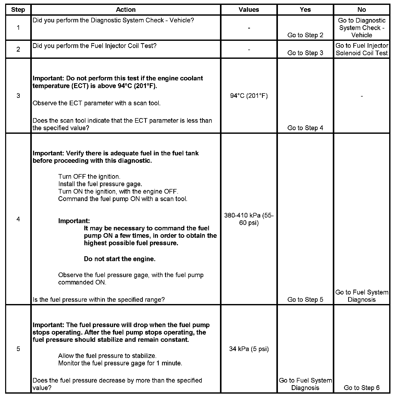 5. This step tests for an internal fuel leak. If the fuel pressure drops during this test, then an internal loss of pressure is indicated. The fuel pressure should reach a steady value.