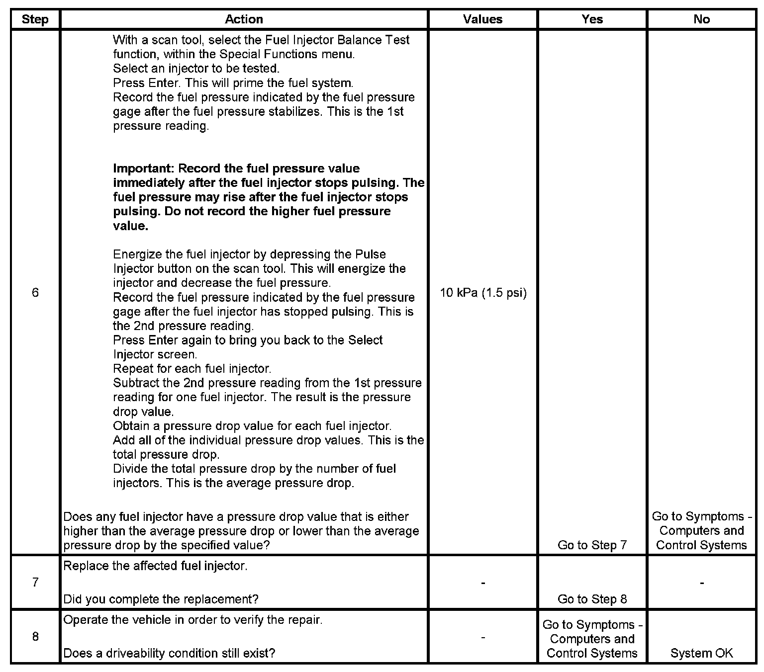 6. If the pressure drop value for each fuel injector is within 10 kPa (1.5 psi) of the average pressure drop value, the fuel injectors are flowing properly. Calculate the pressure drop value for each fuel injector by subtracting the second pressure reading from the first pressure reading.