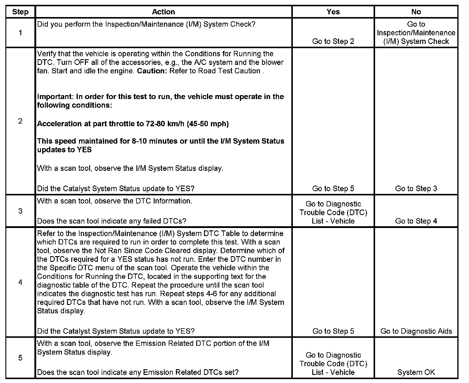 The purpose of this test is to satisfy the enable criteria necessary to execute inspection/maintenance (I/M) readiness diagnostics for the catalyst system. The test may be used to set the I/M System Status indicators to YES. Ensure the vehicle meets the requirements listed in Conditions for Running before performing this test. Failure to meet the necessary requirements may produce inaccurate test results.