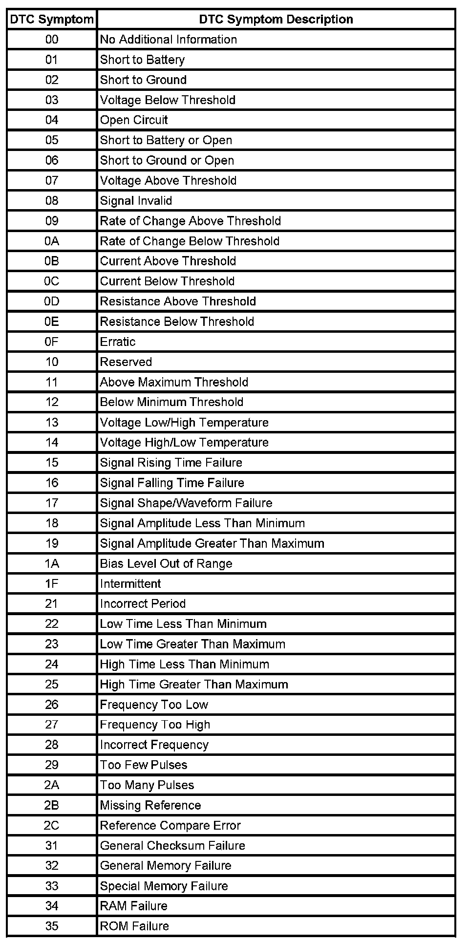 The DTC symptom is made up of 2 alphanumeric digits. The first digit following the DTC indicates the DTC symptom category. There are 16 possible categories available in the range of 0 through the letter F. Currently there are 8 categories in use, 0 through 7. These 8 categories together with their definitions are given below.