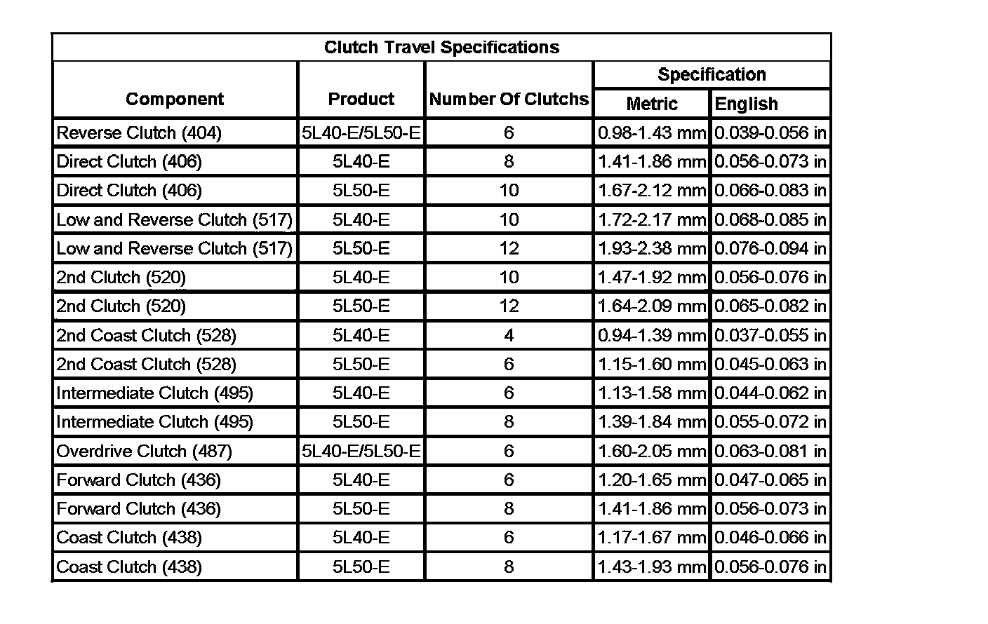 Clutch Piston Travel Specifications: