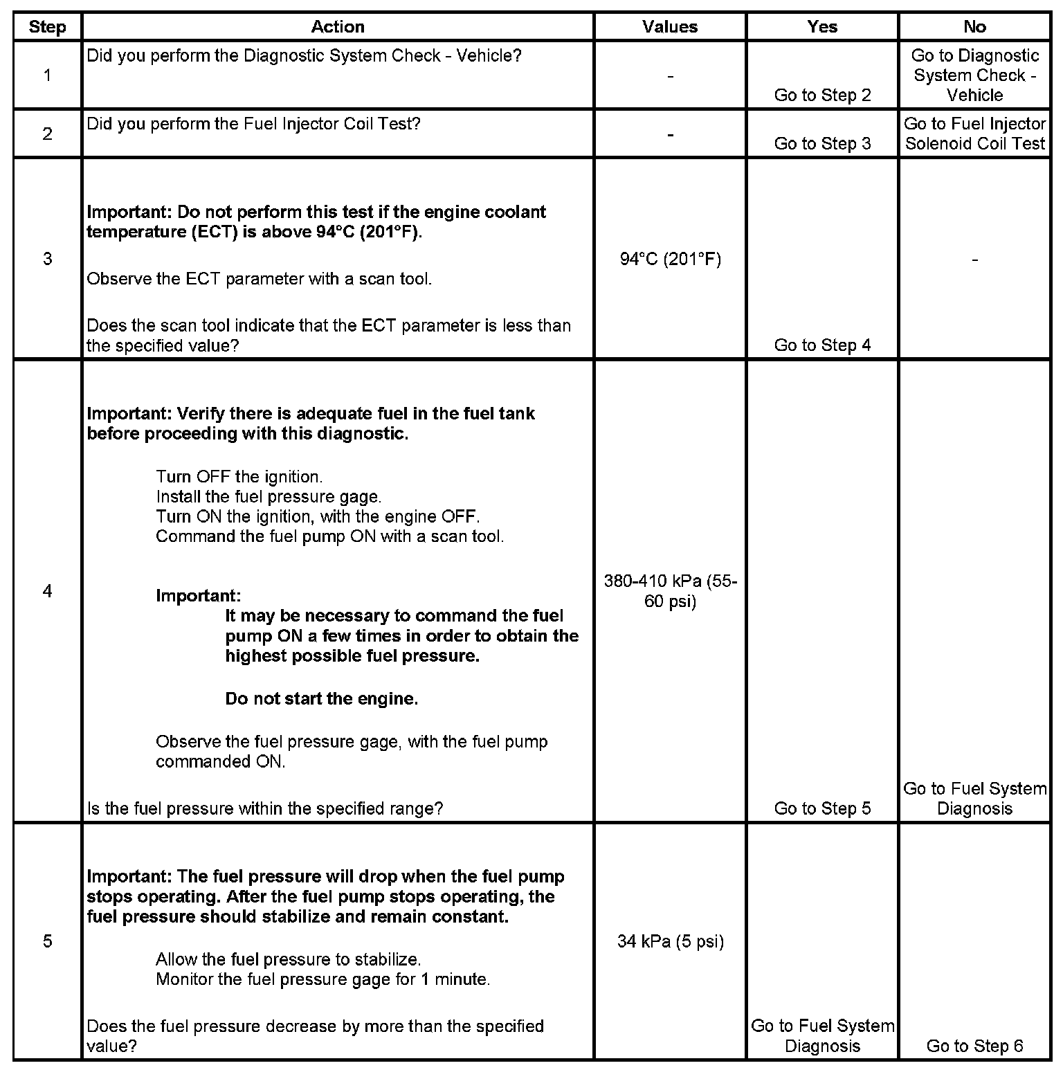 5. This step tests for an internal fuel leak. If the fuel pressure drops during this test, then an internal loss of pressure is indicated. The fuel pressure should reach a steady value.