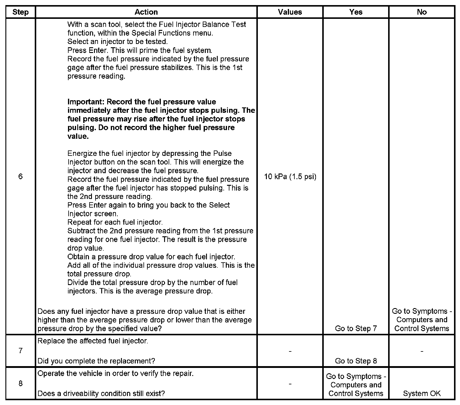 6. If the pressure drop value for each fuel injector is within 10 kPa (1.5 psi) of the average pressure drop value, the fuel injectors are flowing properly. Calculate the pressure drop value for each fuel injector by subtracting the second pressure reading from the first pressure reading.