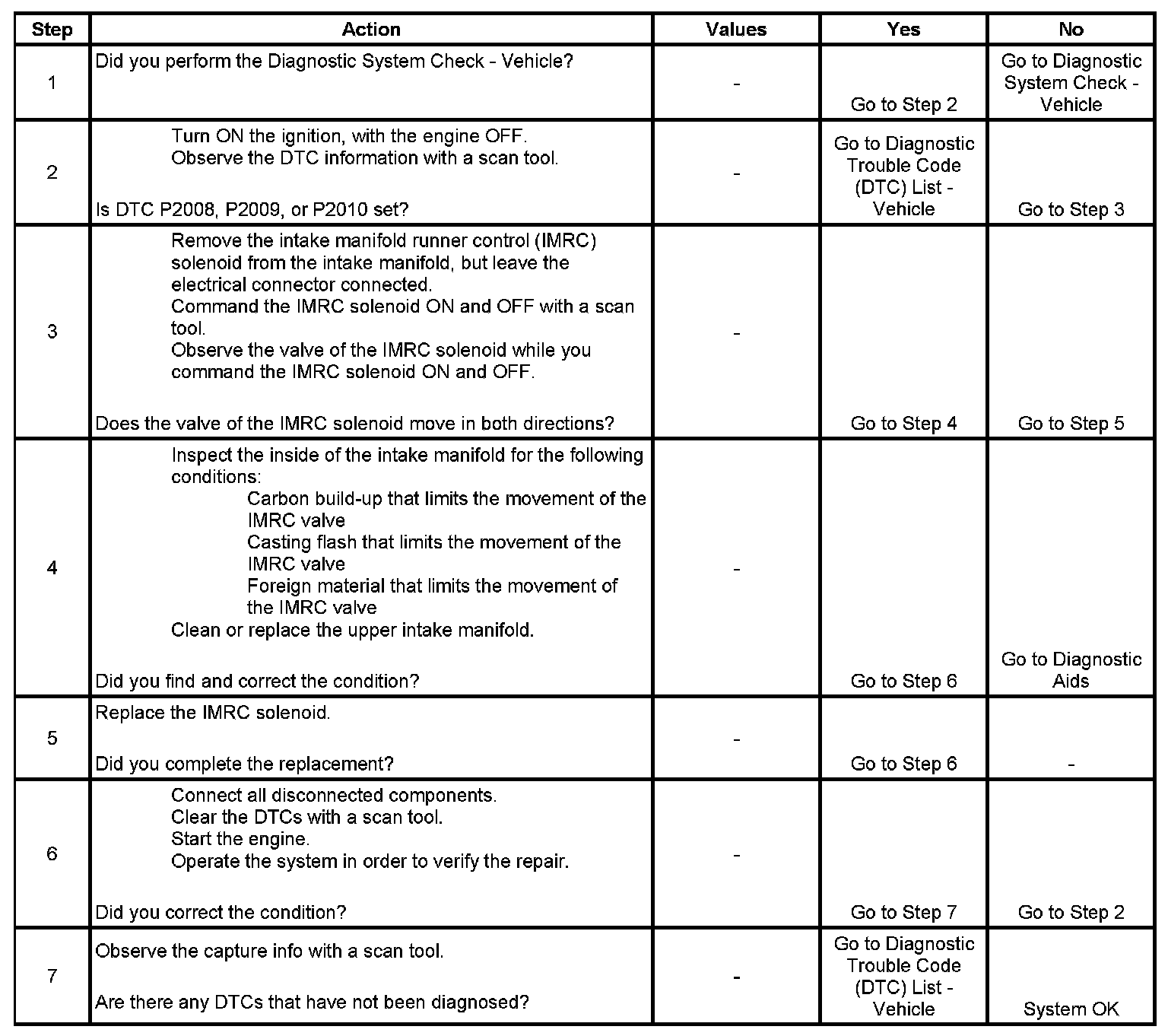 2. This diagnostic table will only diagnose the mechanical portion of the IMRC solenoid. If there is a DTC set for the IMRC solenoid, refer to the appropriate DTC table.